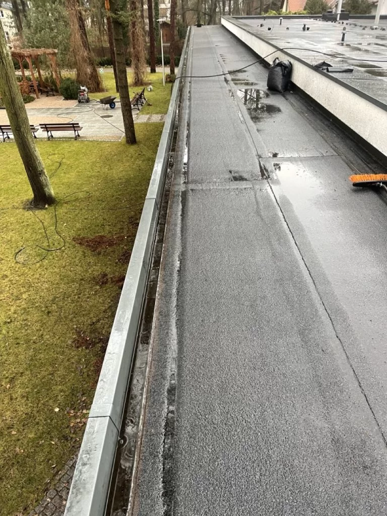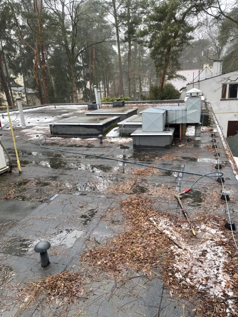 Budynek restauracji wykonany w technologii dachu płaskiego pokryty został papą termozgrzewalną. Jak każdy płaski dach znajdujący się w pobliżu dużej ilości drzew gromadzi dużo zanieczyszczeń. Są nimi gałęzie, liście, a także mech który wrasta w papę termozgrzewalną. Wszystkie zabrudzenia zostały zebrane ręcznie, zapakowane w worki i wyniesione w miejsce składowania. Po oczyszczeniu głównej połaci tej części budynku przystąpiliśmy do czyszczenia rynien.